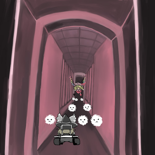 ・紅魔館コース 9つの部屋と通路で構成されているコース。 周を重ねるごとに何処かの部屋にランダムでフランドールが出現し、 プレイヤーの邪魔をしてくる。 攻撃は @当たるとスピンする光線剣を構えて突撃。 A毛玉を1〜2個隙間を空けて迷路状に配置する。 Bカベで跳ね返る毛玉を3個投げて来る。 C直進して壁で消える毛玉を5個投げて来る。 …の4種類。